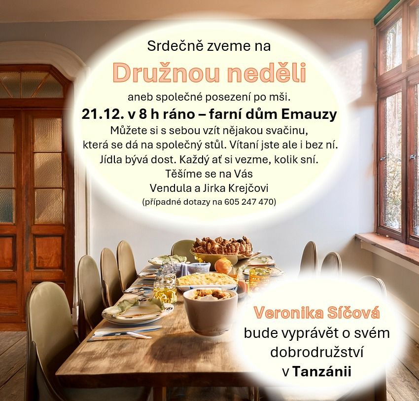 Aneb společná snídaně po mši, s besedou o Tanzánii. Můžete s sebou vzít i jednoduchou snídani, která se dá na společný stůl. Ale vítáni jste i bez ní. Jídla býva dost. Každý ať si vezme, kolik sní. Těšíme se na Vás. Vendula a Jiří Krejčovi (případné dotazy na 605 247 470).
