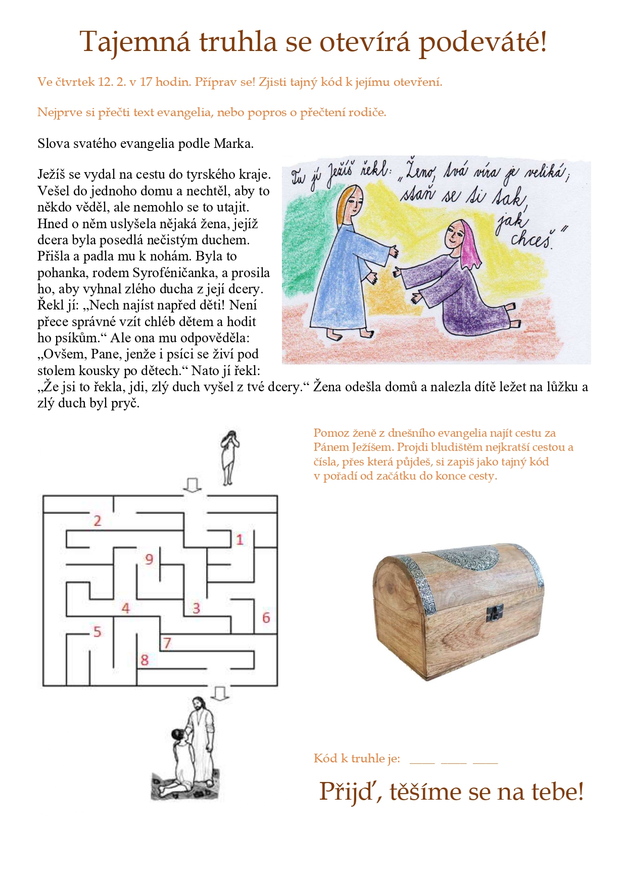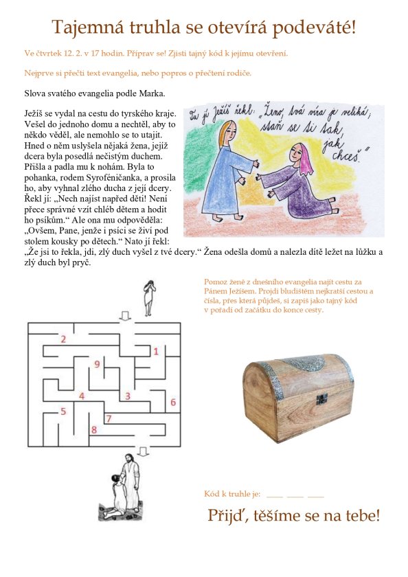 Poklady tajemné truhly. Každý druhý a čtvrtý týden v měsíci (většinou) ve čtvrtek v 17.00 zveme všechny děti a jejich rodiče (i ostatní farníky) na mši pro rodiny s dětmi.